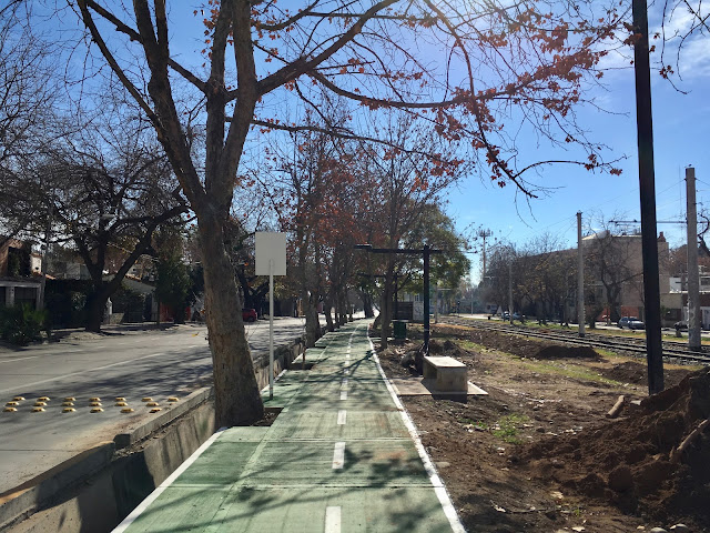 Está casi terminada la continuación de la ciclovía que viene desde Godoy Cruz hasta calle Moreno y continua hacia el lado de ciudad, extendiéndose por calle Palero/Belgrano, todavía no está inaugurada oficialmente pero se puede circular con precaución.
